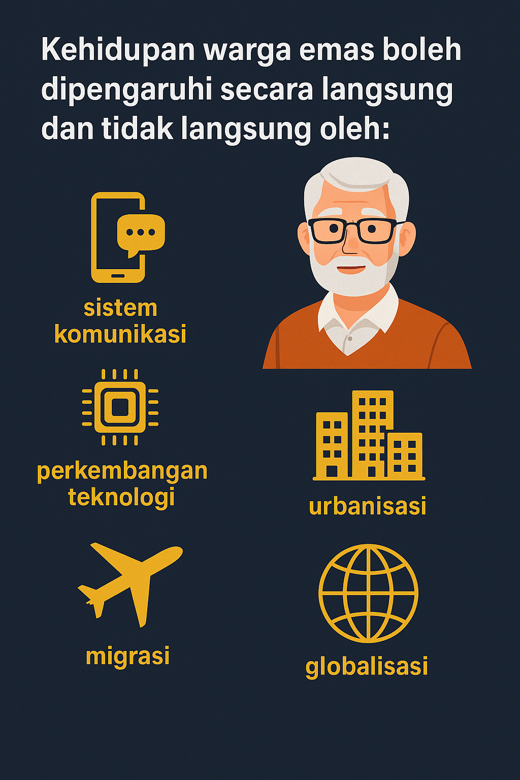 Urbanisasi, migrasi, teknologi, dan globalisasi turut mempengaruhi kehidupan warga emas.